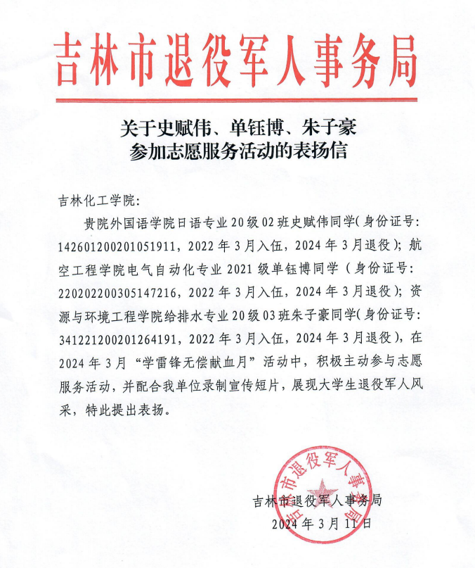 近日,我校资源与环境工程学院给排水2202班朱子豪,外国语学院日语2302班史赋伟和航空工程学院电自2201班单钰博3名新退役的大学生士兵在“学雷锋无偿献血月”活动中,用浓浓爱心传递生命的希望,以实际行动助力公益献血事业,并积极配合录制宣传片,充分展现了化院学子“退伍不褪色,热血映丹心”的军人本色,受到吉林市退役军人事务局通报表扬。