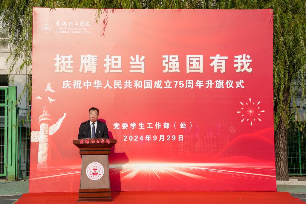 党委副书记李士阳代表学校党委向全体师生员工致以节日的问候和美好的祝愿,祝福伟大祖国繁荣昌盛,国泰民安。他指出,建校66年以来,学校与祖国同频共振,主动适应经济社会发展需要和行业发展需求,积极开展科学研究和人才培养,为国家和社会培养了大批高级技术与管理人才;未来,学校将以更加昂扬的姿态,向着建设特色高水平应用型大学的目标阔步前行,以高质量发展向新中国成立75周年献礼。李士阳寄语我校青年学子,要始终秉承“严谨、勤奋、求实、创新”的校训精神,将个人成长与国家发展、民族复兴、学校建设血脉相连,将个人的理想追求融入党和国家、母校事业之中,树立青云之志,锻造青春之魂,努力做奋发进取的“筑梦人”,实学苦干的“追梦人”,仰望星空的“圆梦人”,成长为担当民族复兴大任的时代新人。