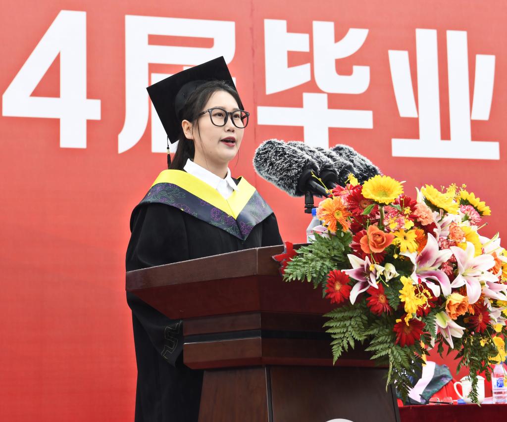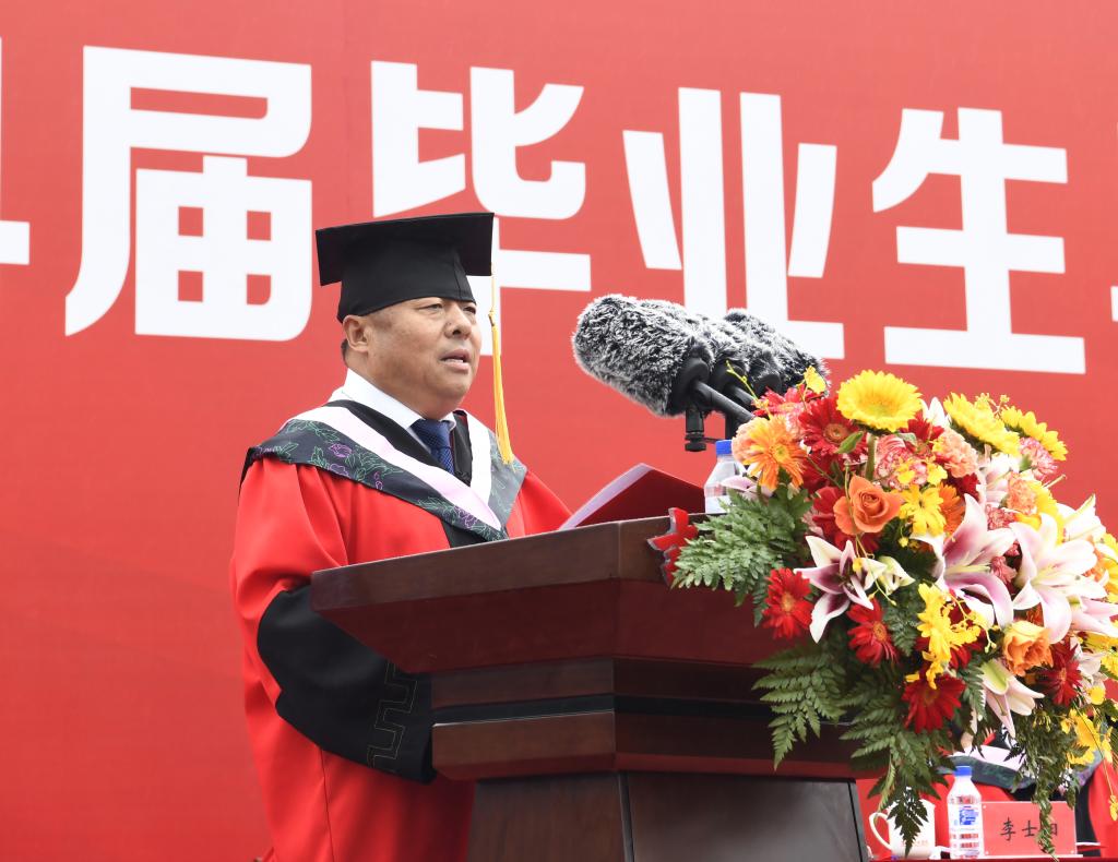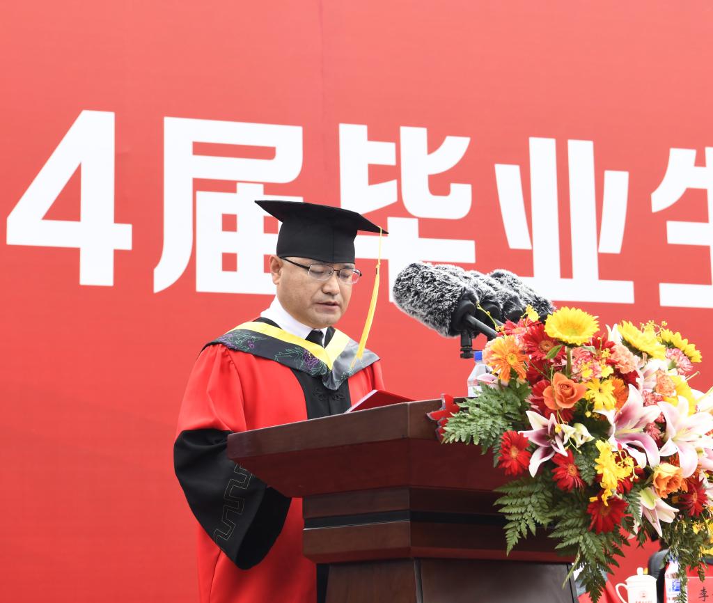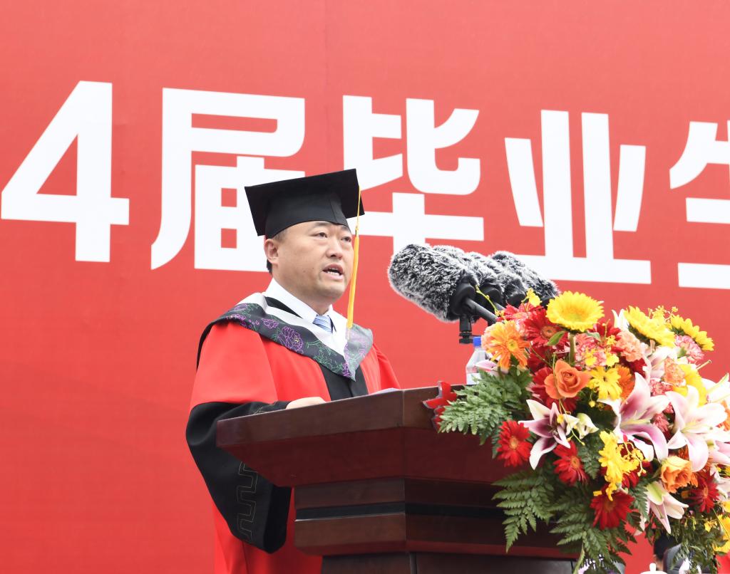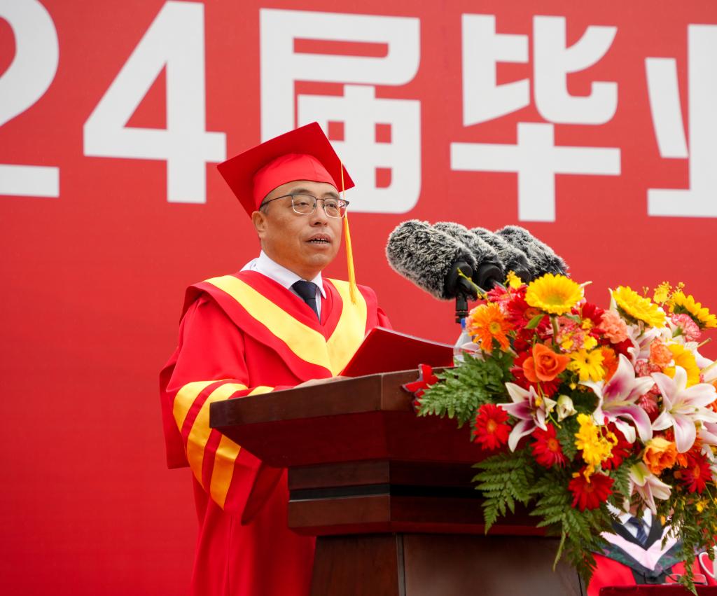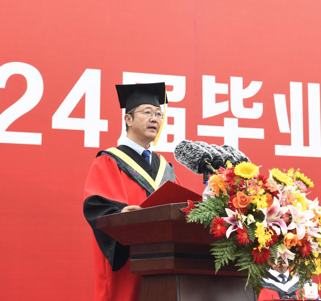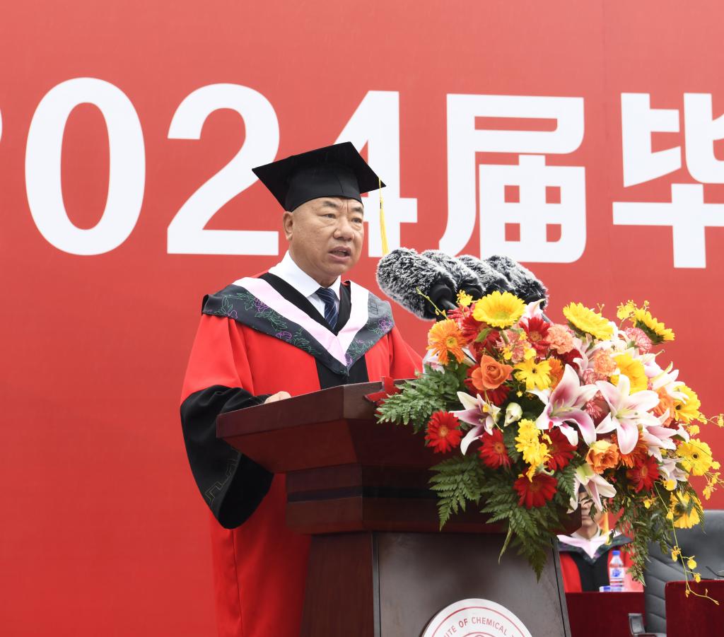 校长艾学忠教授为毕业学生代表颁发毕业证书、学位证书并深情致辞。他首先代表全校师生员工向圆满完成学业的同学们表示最热烈的祝贺和最美好的祝愿,向辛勤养育他们的父母、悉心教导他们的老师,关心和帮助过他们成长的每一位朋友,致以衷心的感谢和崇高的敬意。并向全体毕业生提出四点期望:第一,要胸怀天下,树立化院人志存高远的信念。他希望同学们传承化院心系家国的精神底色,在奔赴光荣与梦想的远征中,胸怀“跬步江山即寥廓”的豪情,肩负起推动国家繁荣、民族复兴的重任,在强国筑梦的道路上践行“严谨、勤奋、求实、创新”的化院精神,始终与时代同向,与祖国同行,把个体发展融入国家的“大蓝图”之中,让青春的正能量在强国建设的宏伟征程中充分迸发,在中国式现代化建设新征程中挺膺担当!第二,要明礼诚信,做到化院人德才兼备的境界。他希望同学们以后不论处于何种境地,仍然保持化院谦虚向上的姿态,在社会大熔炉里加强磨练、增长本领,勇于挑战高难度工作,不断提升技艺水平,用开阔的视野、丰富的学识、大胆的创新、积极的实践,在激烈的竞争中成就最好的自我。第三,要感恩仁爱,展现化院人重情重义的品格。他希望同学们要常怀感恩之心,用高尚的格调、宽阔的眼界、大爱的情怀看待世界。第四,要敬畏生命,永葆化院人身心愉悦的底线。他希望同学们坚持生命至上,敬畏生命伟力、尊重自然规律,树立人与自然生命共同体意识,以乐观豁达的心态面对实践中的艰难险阻,在人生的赛道上无畏奔跑、砥砺前行,收获人生一路繁花。