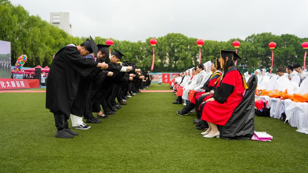 教师代表、石油化工学院党委副书记周桂莲,优秀校友代表、吉化北方公司副总经理、总工程师邸鸿,2024届毕业生代表、化学与制药工程学院制药工程专业2001班马硕,毕业生家长代表分别发言。毕业生代表用中华传统礼仪表向师长行“谢师礼”,表达对母校,老师、家长的敬意与感激之情,并向教职工代表、家长代表献花。主席台导师为现场2024届毕业生行拨穗礼。