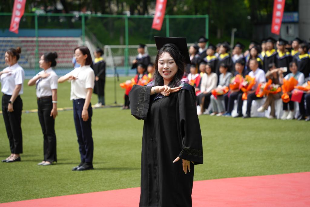 典礼在“堂堂正正一辈子”手语操表演中圆满礼成。无声的手势胜过有声的语言,全体毕业生同学们跟随辅导员老师一起,和着优扬的旋律,以优美的手语动作用心用情诠释出心中对母校的感恩情怀。每一位同学的深情演绎,让在场所有师长为之动容。
