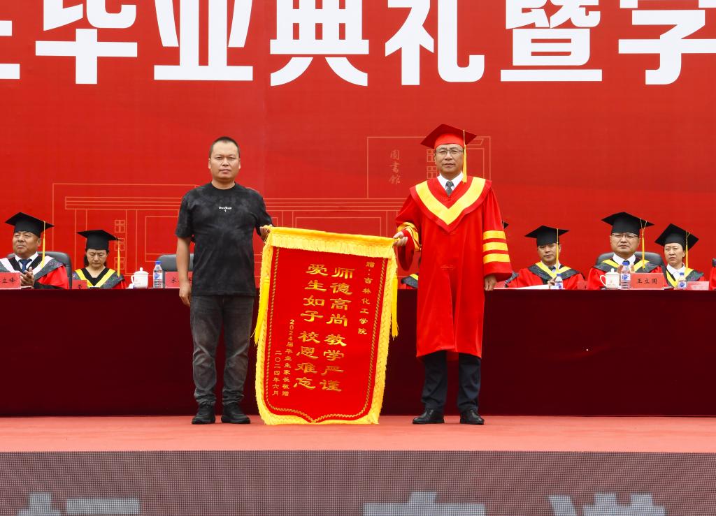 毕业生家长代表向学校赠送锦旗,学校党委书记宋春辉教授代表学校接旗。