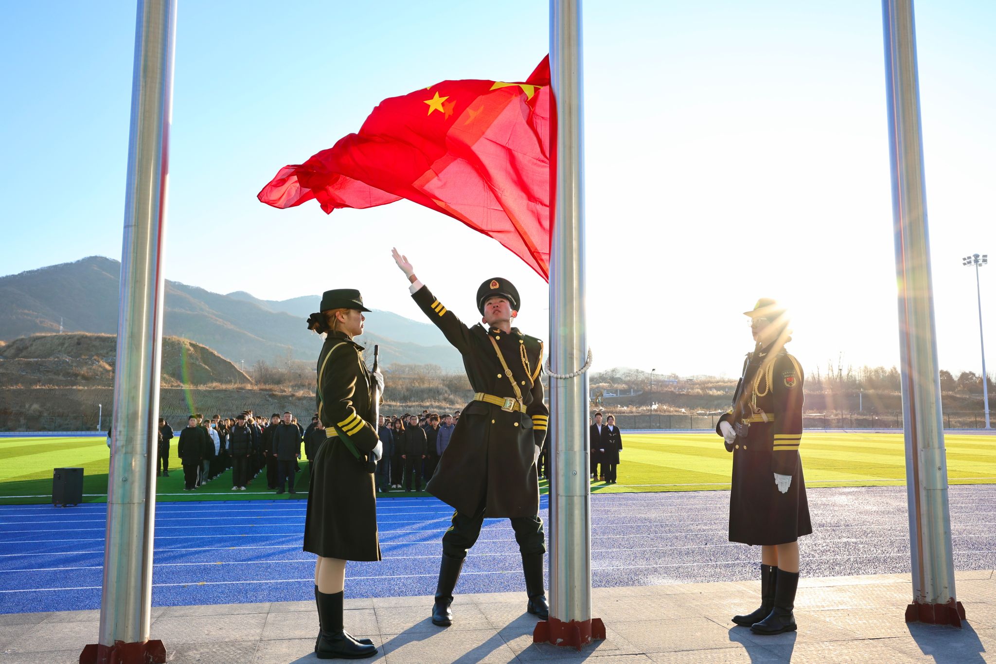 清晨7:20,升旗仪式正式开始。伴随着激昂雄壮的《义勇军进行曲》,护旗手迈着铿锵有力的步伐,护送五星红旗入场。国歌奏唱完毕,五星红旗高高飘扬在新校区的体育场上,与崭新的教学楼、朝气蓬勃的学子身影相映成景,彰显着学校蓬勃发展的生机与活力。