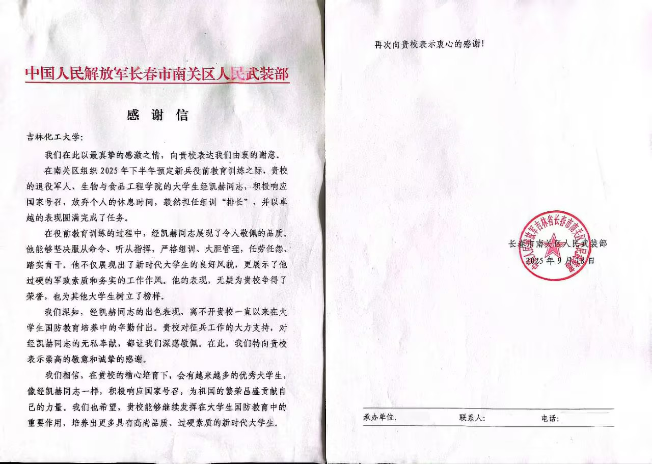 近日,学校收到来自中国人民解放军长春市南关区人民武装部的感谢信。信中,对学校生物与食品工程学院生物2304班退役大学生经凯赫同学在南关区组织的2025年下半年预定新兵役前教育训练中的突出表现,以及学校长期以来在大学生国防教育、征兵工作中的大力支持表示高度肯定与诚挚感谢。