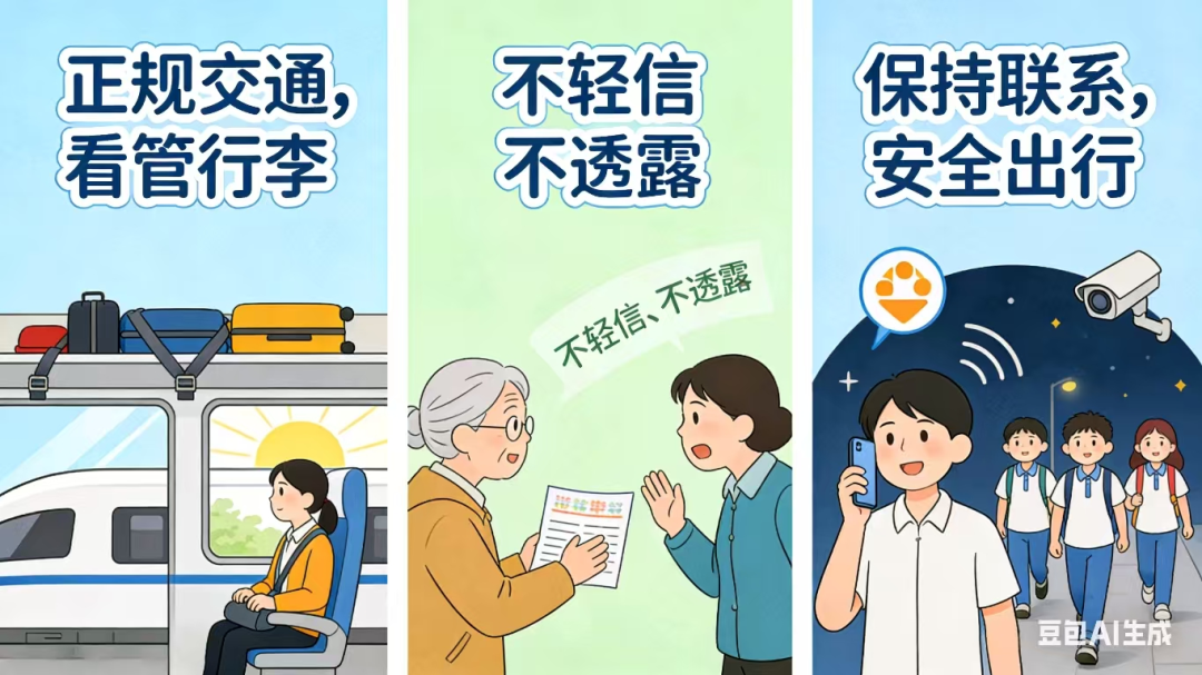 返乡出行请优先选择正规运营的交通工具,坚决不乘坐无牌无证、超载超员的“黑车”。乘坐火车、汽车等公共交通时,务必看管好随身行李,贵重物品不离身,切勿将行李交由陌生人看管。