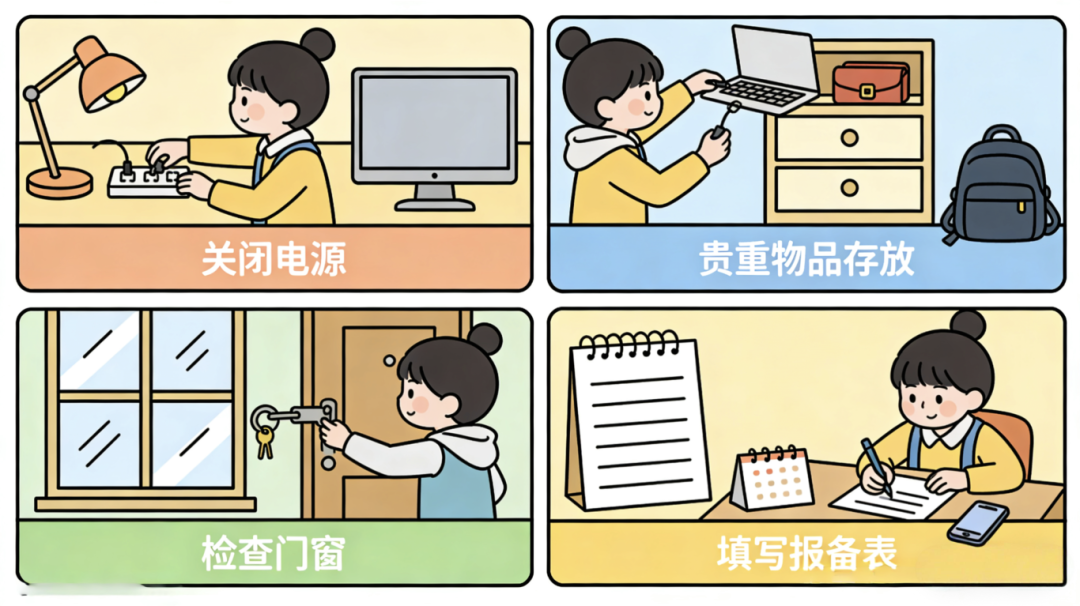 离校前整理好个人衣物、被褥等生活用品,分类收纳整齐;及时清理宿舍内的垃圾、食物残渣,保持宿舍环境整洁干爽。最后离开宿舍的同学,务必反复检查门窗是否关严锁牢,阳台窗户也要确认关闭,避免雨雪侵入或外来人员进入。