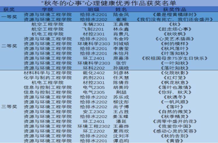 当秋风轻拂过校园的每一个角落,当冬日的暖阳洒满每一寸土地,吉林化工学院的学子们用镜头捕捉下了那些瞬间的美好与深沉。经过两周前“秋冬的心事”心理健康优秀作品征集活动的选拔,以下是优秀作品获奖名单。