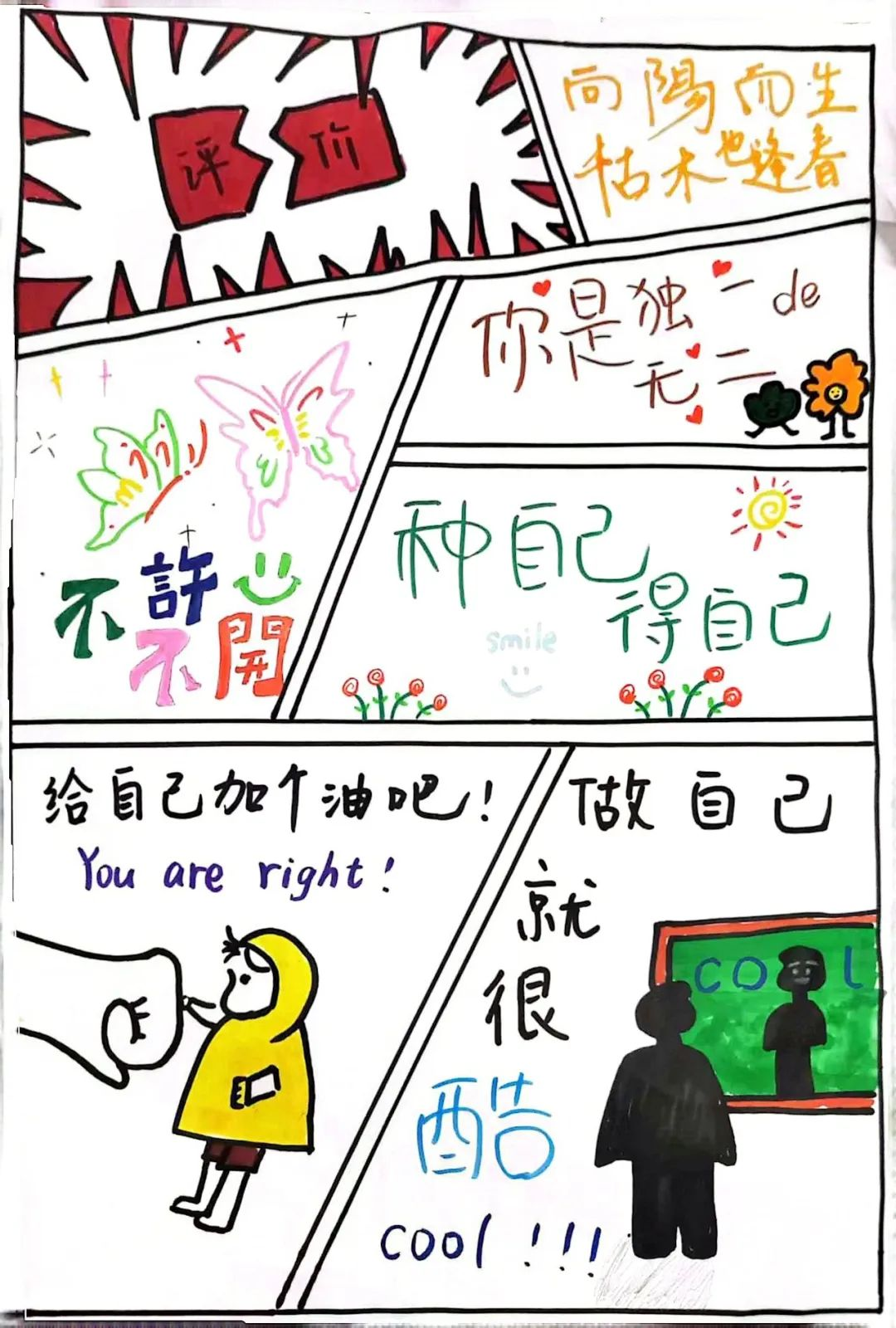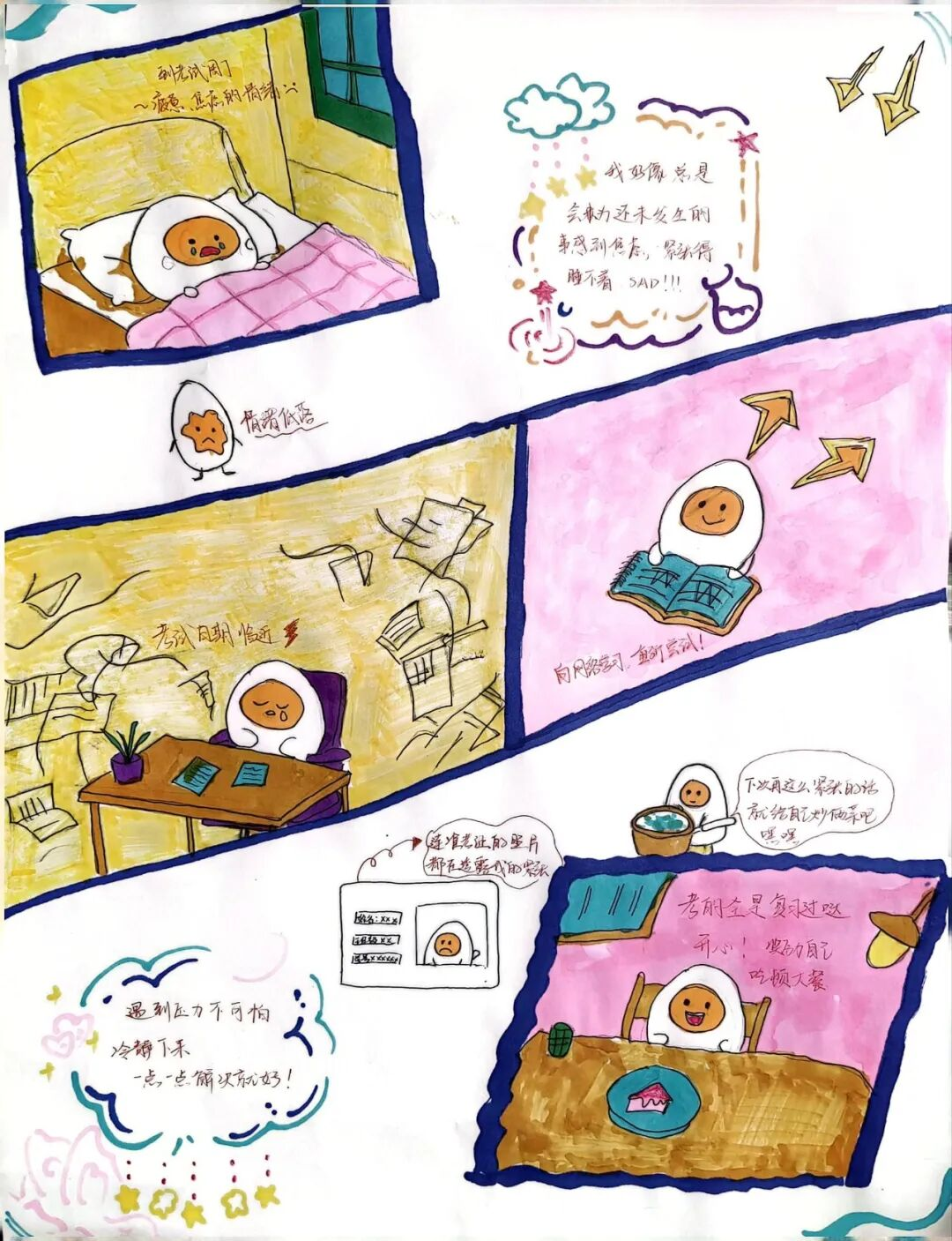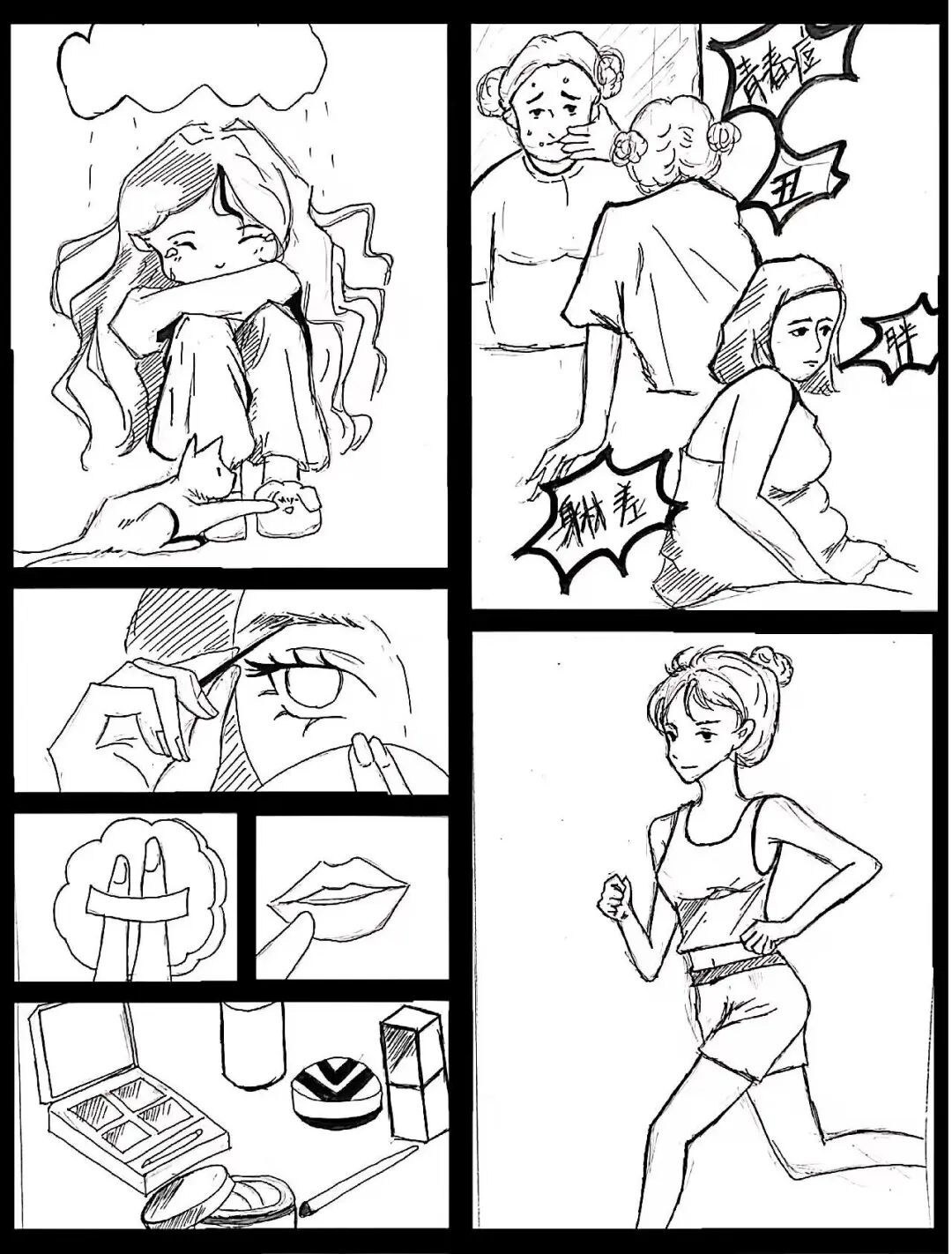 作品简介:以五格漫画展现主人公对身材变化的心态转变, 从担忧变胖,到朋友鼓励,再到领悟爱自己 的真谛。结尾的文字点明主旨,传达出要接纳不完美、爱完整自我的积极态度,是对自我关爱的美好诠释。