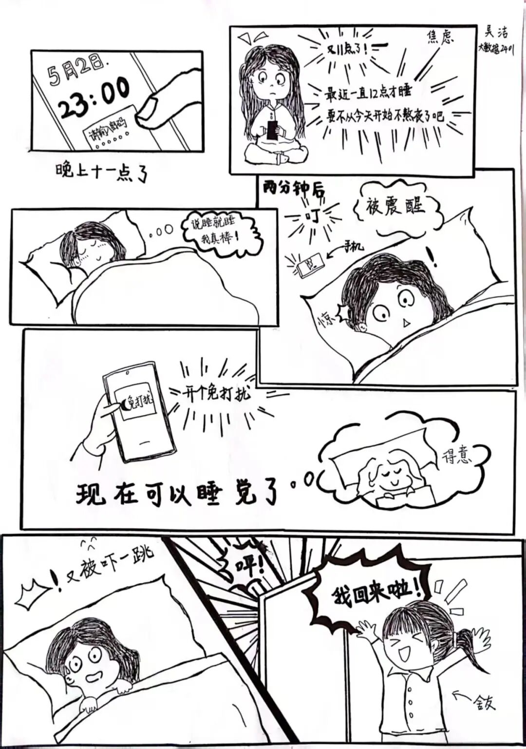 作品简介:作品描绘主人公决心不熬夜入睡,却先后被手机震动、舍友声响打断。展现了在追求良好睡眠过程中,外界干扰不断,凸显入睡难的现实困境与无奈。