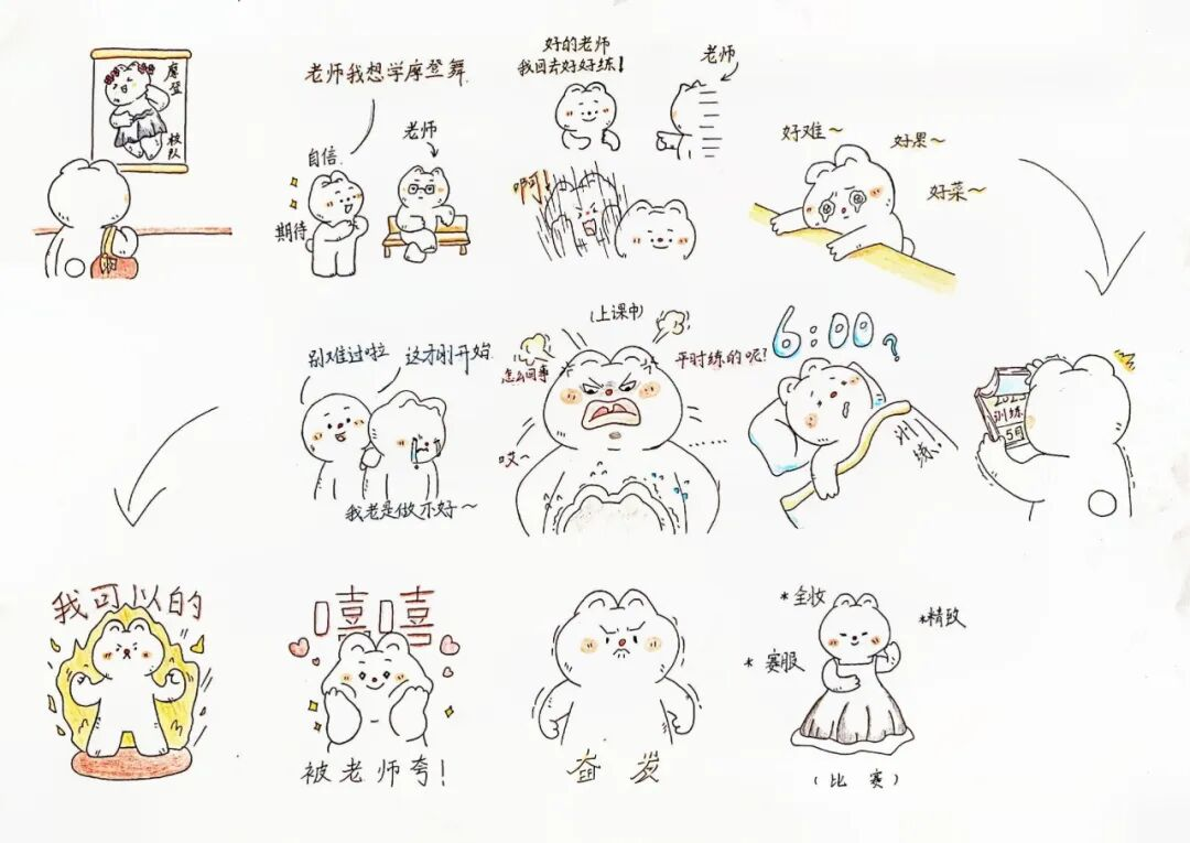 作品简介:这幅画描绘小熊想学摩登舞,从最初自信期待,到练习时历经艰难想放弃,再到重拾信心、勤奋练习,最终获夸参赛。展现了面对困难不气馁,坚持就能收获成长的过程。