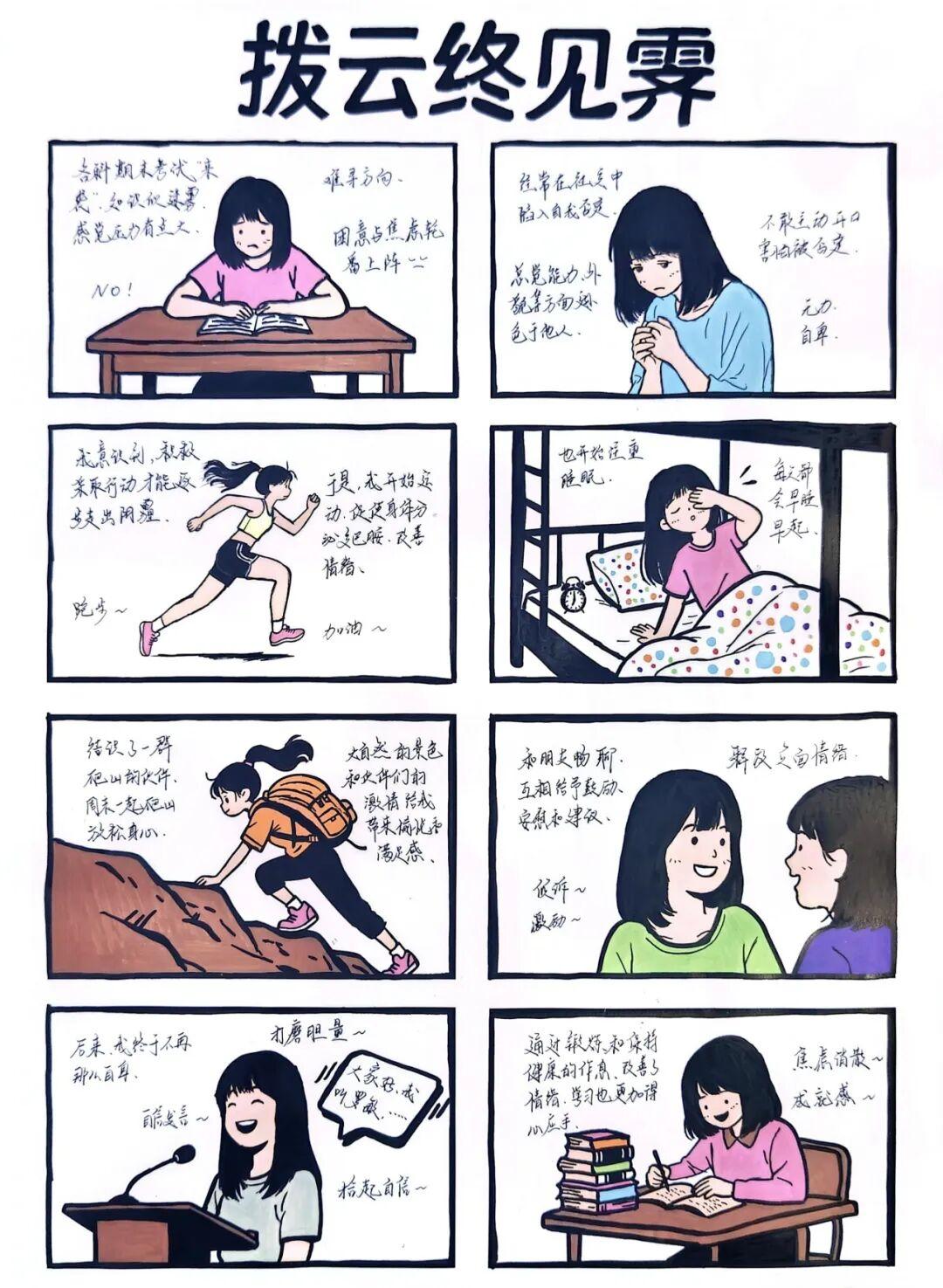 作品简介:考试周的压力如乌云压顶,自我否定的迷雾在心底弥漫,遮蔽了光亮。为驱散焦虑,我奔向操场挥洒汗水,用画笔定格自己奋力奔跑的身影,也描绘登山途中征服陡坡的瞬间。拨云终见霁,所有的努力都会化作照亮前路的光,如今笔下自信昂扬的姿态,正是战胜焦虑后重获的从容与坚定。