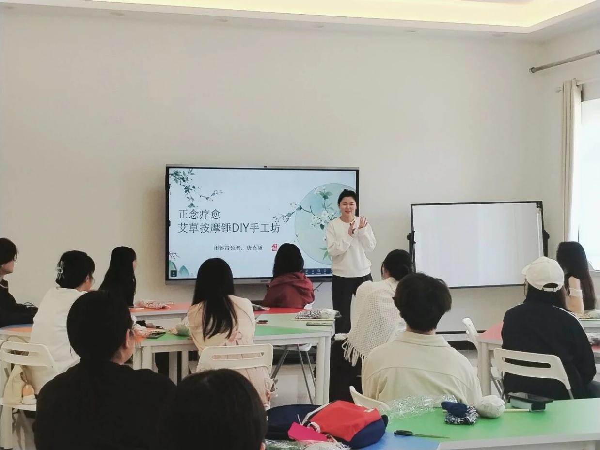5月27日下午,心理中心唐嵩潇老师带领同学们开展了正念疗愈艾草按摩锤DIY手工坊团体心理辅导活动。本次活动以正念活动为媒介,以传统艾草按摩锤制作为载体,通过手作体验帮助同学释放压力,感受当下,在专注的手工过程中获得平静与满足。