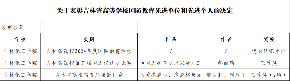 近日,吉林省高等教育学会、国防教育专业委员会公布了《关于表彰吉林省高等学校国防教育先进单位和先进个人的决定》,学校荣获吉林省高校2024年度国防教育活动优秀组织单位,国旗仪仗队荣获吉林省高校第五届国旗仪仗队三等奖,2项作品获军训摄影展示三等奖。