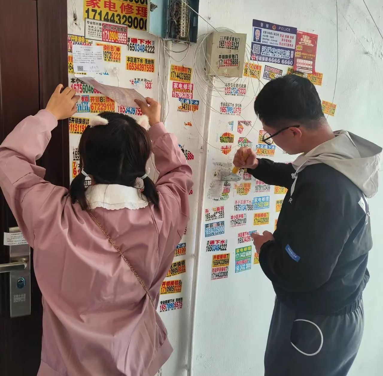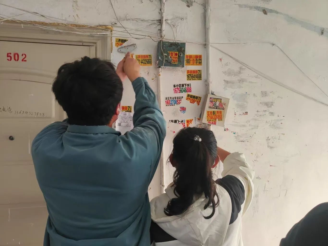 志愿者们分工明确,迅速投入到清理工作中。他们带着铲子、壁纸刀、除胶剂等工具,细心地用铲除贴在宣传栏上的小广告,再用湿抹布擦拭干净,确保墙面恢复原有的整洁与美观。在他们的努力下,原本被小广告覆盖得密密麻麻的墙面焕然一新。