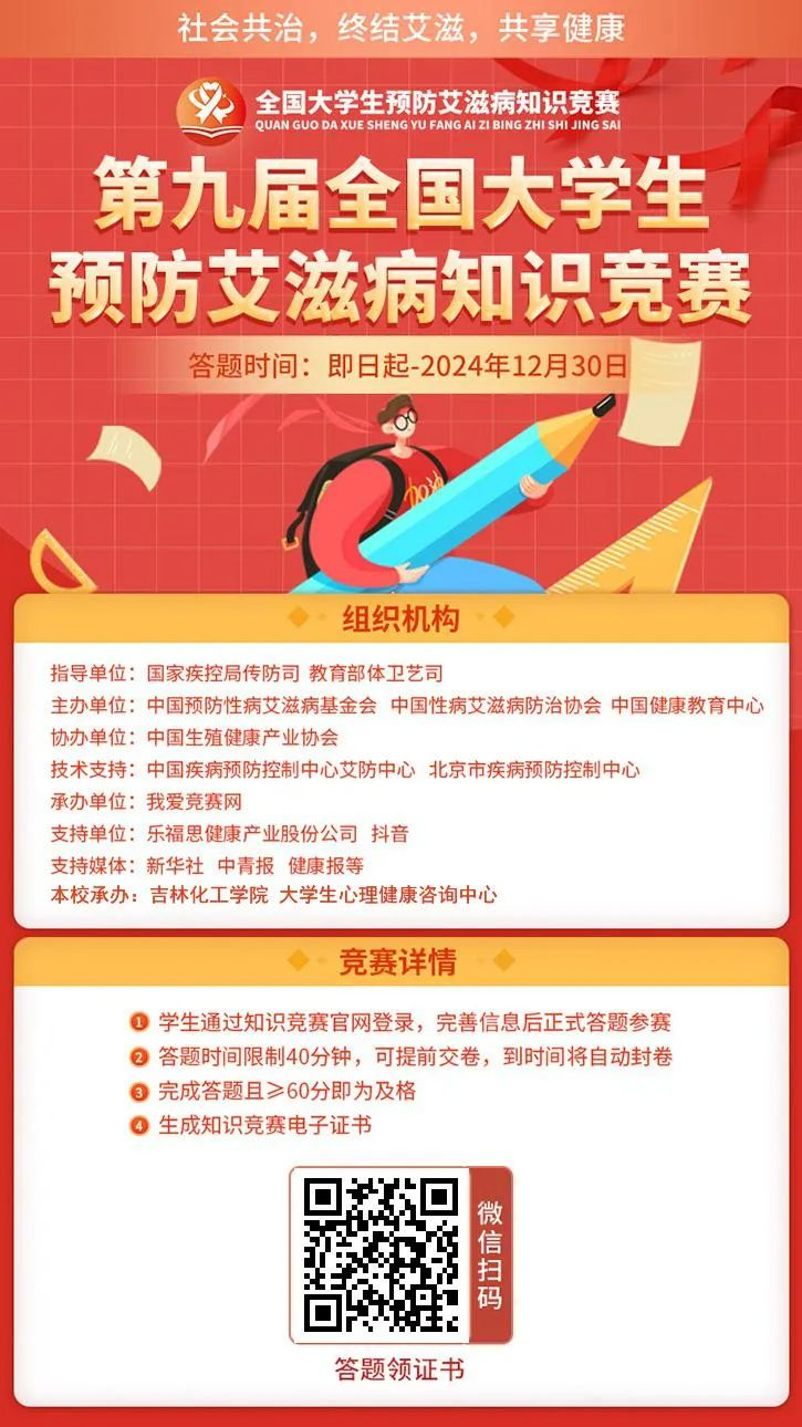 为贯彻落实党中央、国务院决策部署,推进联合国2030年终结艾滋病流行可持续发展目标的实现。积极响应“社会共治,终结艾滋,共享健康”2024国家防艾宣传主题,实施健康中国战略,中国预防性病艾滋病基金会、中国性病艾滋病防治协会与中国健康教育中心联合主办了第九届全国大学生预防艾滋病知识竞赛。我校为响应国家号召,于12月1日正式启动吉林化工学院第九届全国大学生预防艾滋病知识竞赛活动,欢迎广大同学参与!